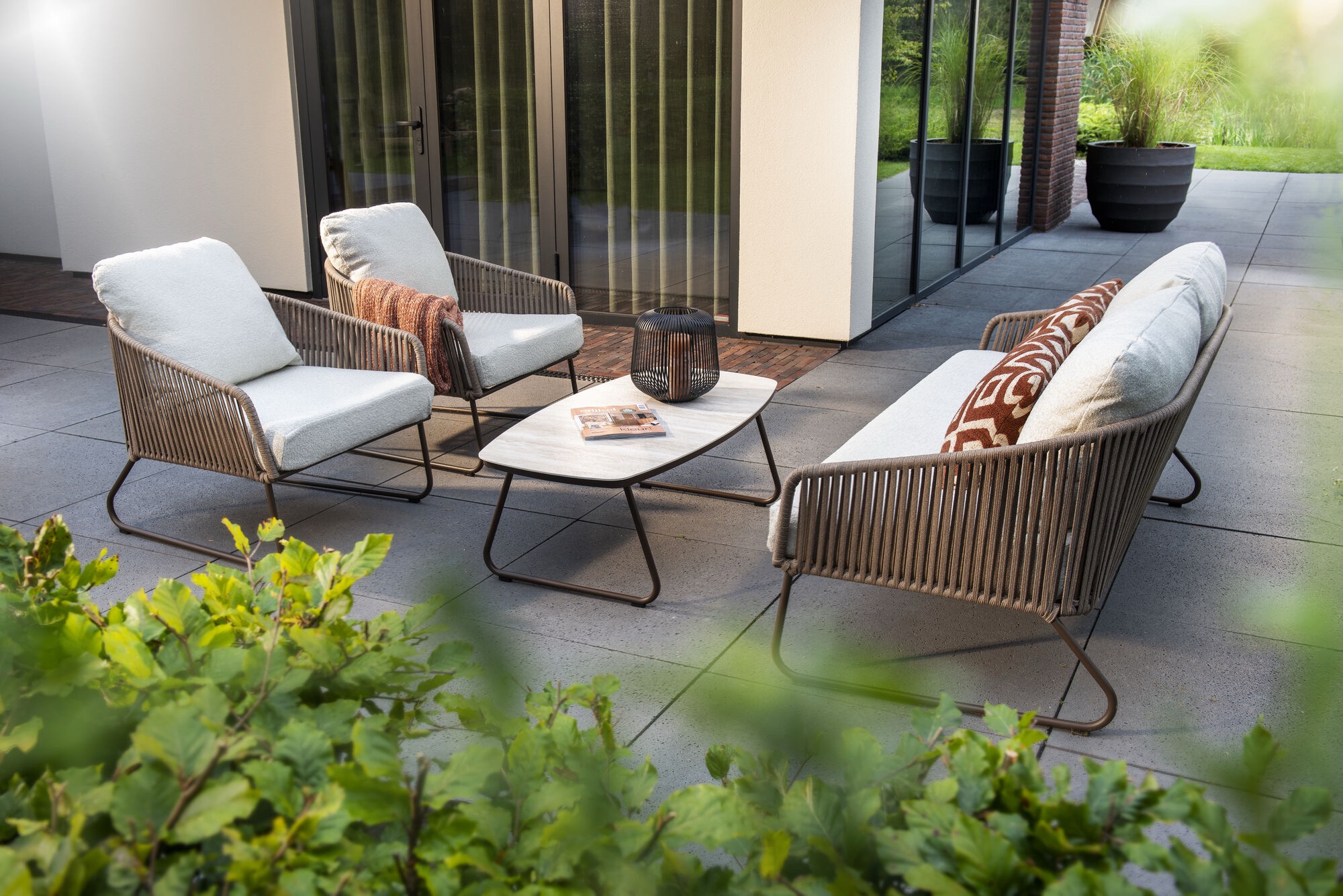 De Calera Lounge Set brengt comfort en elegantie samen in een stijlvolle samenstelling. Met twee lounge chairs, een sofa en een bijpassende coffee table met een keramisch travertinblad en bronzen sledepoten, biedt deze set alles voor ontspannen momenten in de buitenlucht. De warme uitstraling van het bronzen aluminium frame, de toffeekleurige belt rugleuning en de zachte bouclé kussens in Wool White creëren een tijdloze en uitnodigende sfeer. De Calera Lounge Set is perfect om jouw terras of tuin om te toveren tot een oase van rust en stijl.