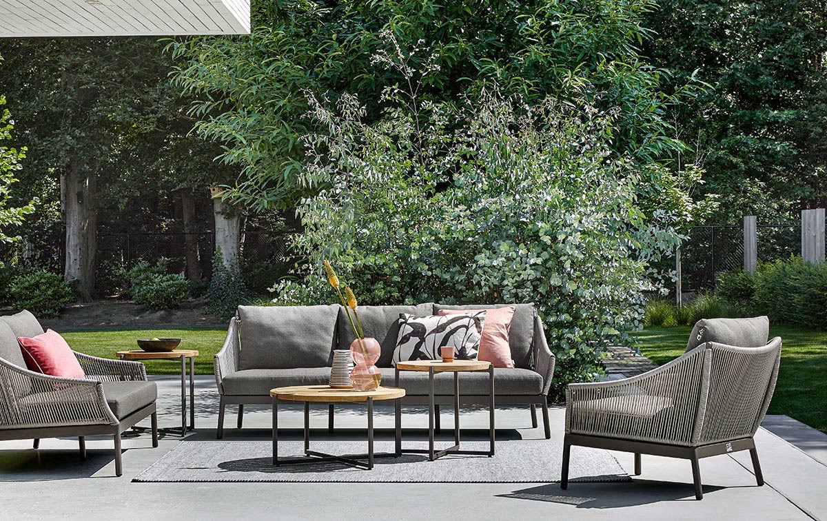 De royale Bijou 3 zits sofa met aluminium frame heeft stevig rope weaving in de kleur Ash grey en all weather Bee Wett kussens.