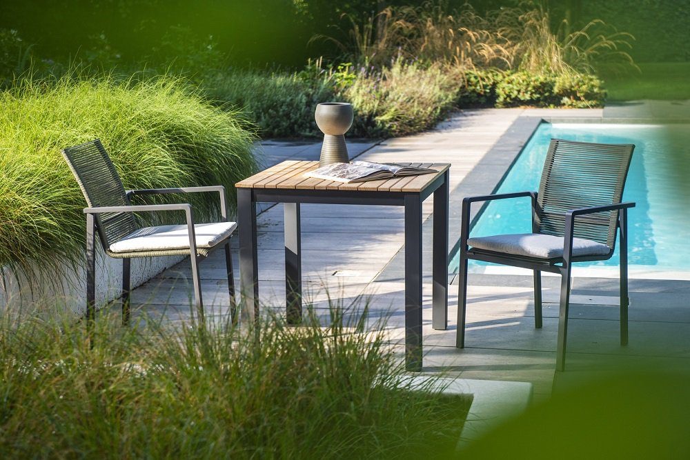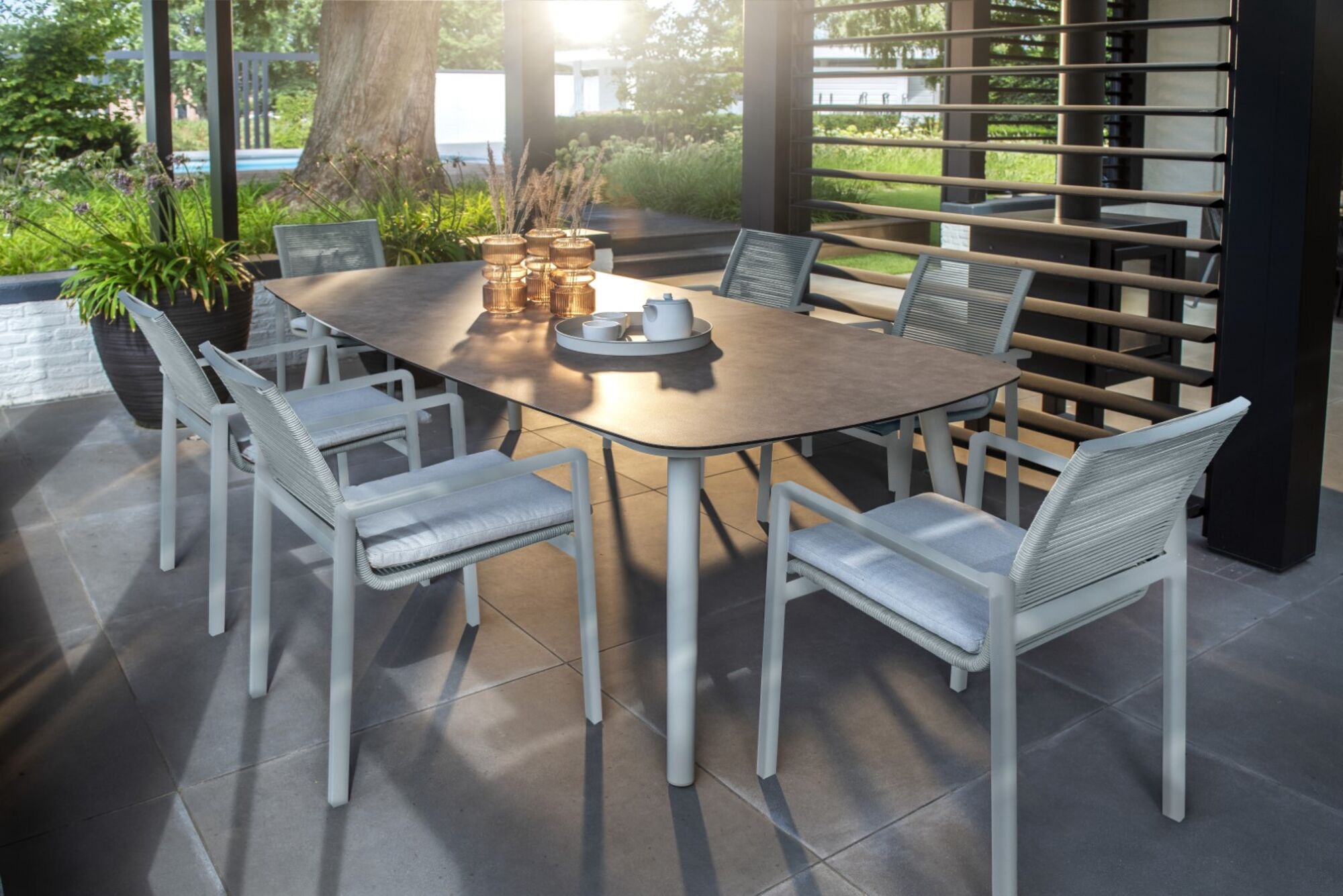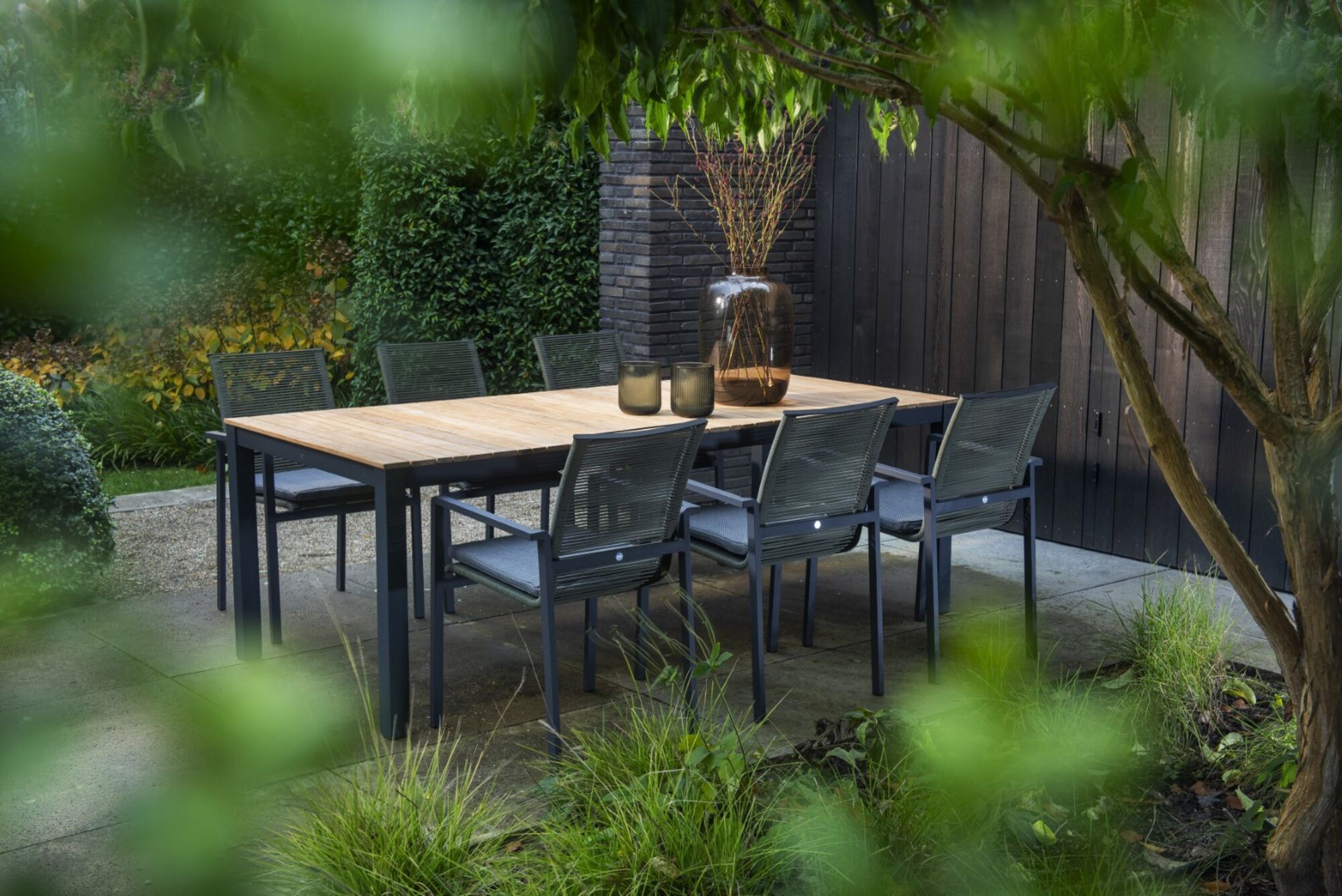 De Ishi stapelbare eetstoel met een donkergrijs aluminium frame en groene rope combineert modern design met functionaliteit. Het eigentijdse lamellenpatroon van all-weather draad maakt de stoel geschikt voor buitengebruik, met vocht- en schimmelbestendigheid. Het donkergrijze aluminium frame voegt een eigentijdse uitstraling toe, terwijl het groene touwdetail een verfrissende en levendige touch biedt. Deze stoel is niet alleen een visueel aantrekkelijke toevoeging aan buitenruimtes, maar biedt ook stapelbaarheid voor handige opslag wanneer dat nodig is.
