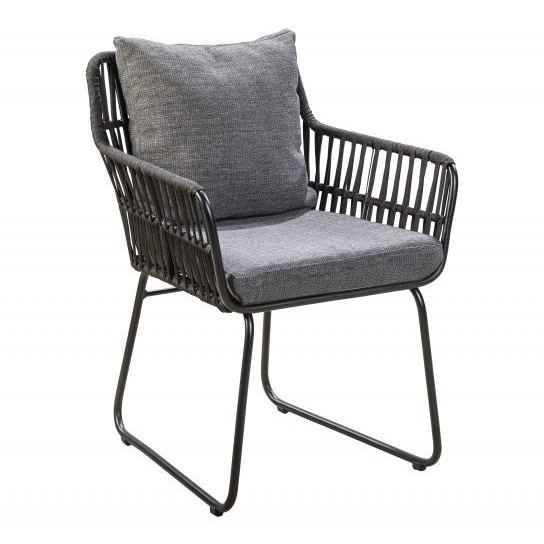Luxe aluminium tuinstoel Mikado is een stijlvolle dining chair met een zwart onderstel en donker kussen. De kleur- en materiaalcombinatie geeft de tuinstoel een unieke uistraling. De stoel is gemaakt van aluminium met rope. Rope is zeer geschikt voor buiten. Dit kunststof draad is sterk, weerbestendig en onderhoudsvrij.